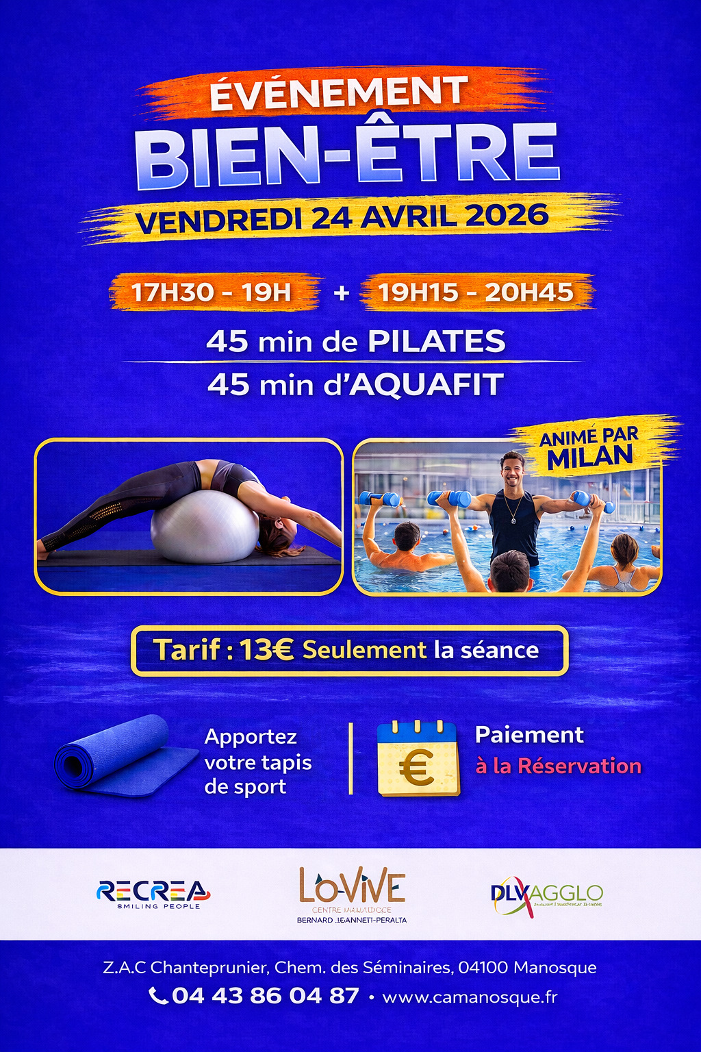 Bassin nordique : 12:00 - 14:00 et 16:00 - 22:00 | Bassin sportif : 07:00 - 09:00, 12:00 - 14:00 et 16:00 - 22:00 | Bassin ludique : 16:00 - 22:00